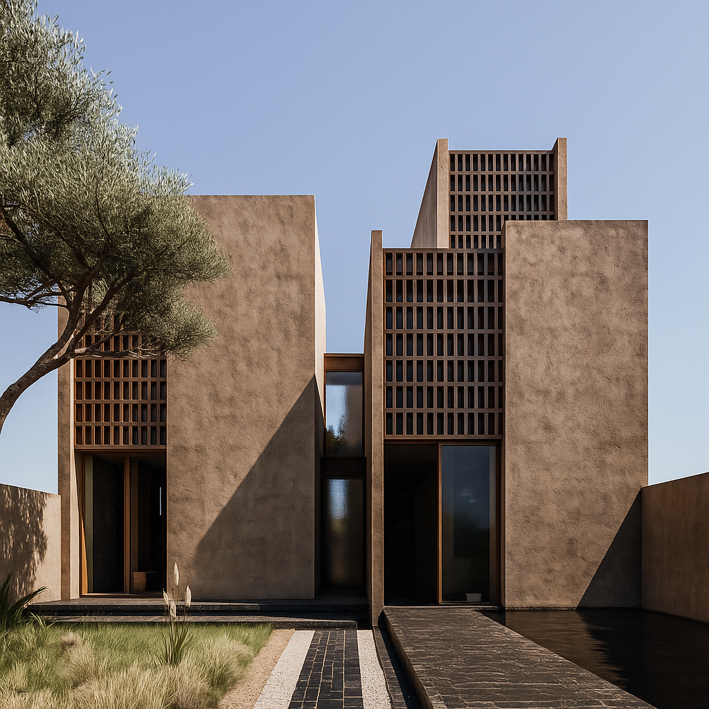 The material palette draws from the warm earth tones of the region, pairing textured, compressed earth walls with soft plaster finishes. Openings are carefully placed and shaded, filtering light into the interiors and framing views of the courtyards. Roof terraces and shaded rooftop spaces offer additional living areas, with the flexibility to accommodate future needs.
